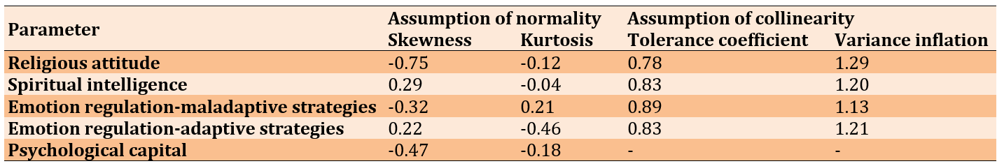 To evaluate the assumption of normal distribution of univariate data, the kurtosis and skewness of the parameters were asssessed. Additionally, to evaluate the assumption of collinearity, the values of the variance inflation factor (VIF) and the tolerance coefficient were examined (Table 2).