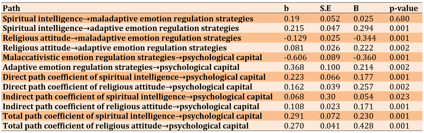 The path coefficients for total spiritual intelligence (p=0.001, β=0.230) and religious attitude (p=0.001, β=0.428) with psychological capital were positive and significant. The path coefficient for adaptive cognitive emotion regulation strategies with psychological capital (p=0.001, β=0.214) was positive, while the path coefficient for maladaptive cognitive emotion regulation strategies with psychological capital (p=0.001, β=-0.360) was negative and significant. The indirect path coefficients for spiritual intelligence (p=0.023, β=0.054) and religious attitude (p=0.001, β=0.171) with psychological capital were both positive and significant. These findings indicate that cognitive emotion regulation strategies mediate the relationship between spiritual intelligence and religious attitude with psychological capital in a positive and significant manner. Using Baron and Kenny’s formula, the indirect path coefficient between spiritual intelligence and psychological capital through adaptive strategies (p=0.001, β=0.061) was positive and significant. In contrast, the indirect path coefficient between these two variables through maladaptive strategies was not significant. Additionally, using this formula, the indirect path coefficients between religious attitude and psychological capital through adaptive strategies (p=0.019, β=0.046) and through maladaptive strategies (p=0.001, β=0.122) of cognitive emotion regulation were both positive and significant. Therefore, both adaptive and maladaptive cognitive emotion regulation strategies positively and significantly mediated the relationship between religious attitude and psychological capital in children of veterans. The results also indicated that adaptive cognitive emotion regulation strategies, unlike maladaptive strategies, mediated the relationship between spiritual intelligence and psychological capital in children of veterans (Table 4).