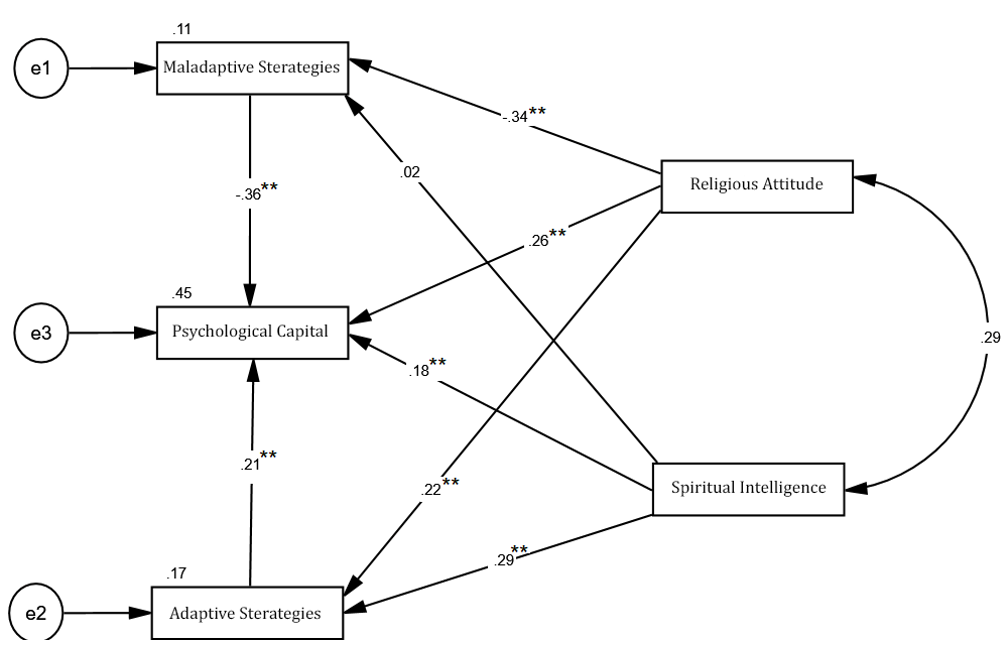 The sum of squared multiple correlations for the psychological capital variable was equal to 0.45. Accordingly, spiritual intelligence, religious attitude, and cognitive emotion regulation strategies explained a total of 45% of the variance in psychological capital among children of veterans (Figure 1).