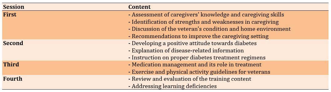 A diabetes education program was developed using relevant sources and under the guidance of diabetes experts and faculty members. After incorporating expert feedback, the program was validated. The intervention consisted of four face-to-face training sessions, each lasting 40 to 60 minutes, conducted in veterans’ homes over a four-week period. Sessions were scheduled weekly, and prior coordination was ensured with caregivers.