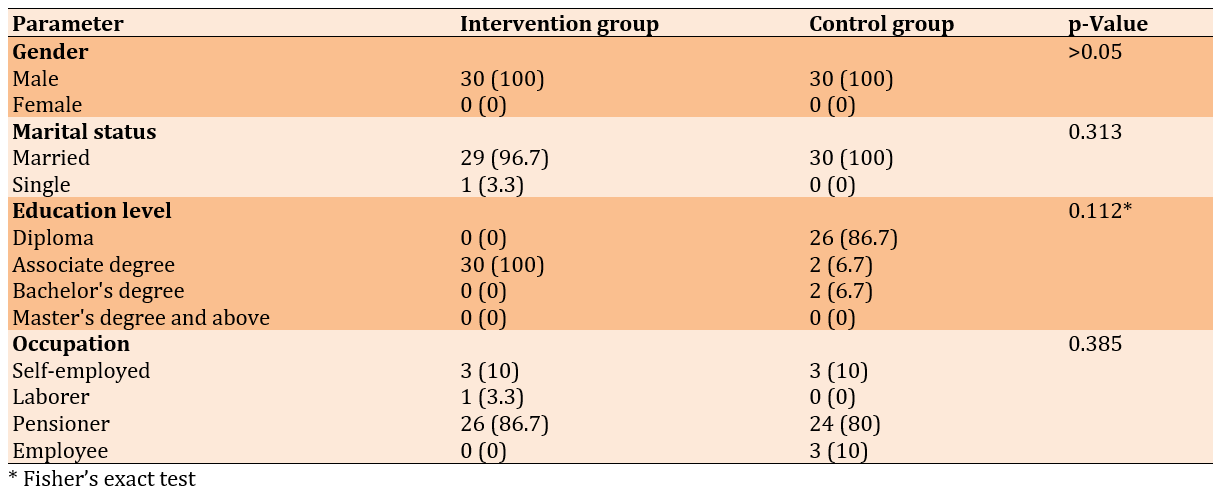 The mean age in the intervention group was 60.30±3.52 years, while in the control group it was 59.97±4.27, with no significant difference between the groups (p=0.746). The frequency distribution of veterans’ demographic characteristics was not different between the two groups. Additionally, all veterans in both groups had no acute illness or stressful events (p>0.05) and similar disability ratings (p = 0.956) in the last six months (Table 3).