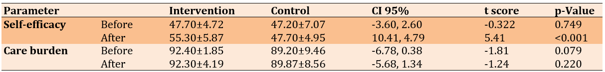 Table 4. Comparison of the mean self-efficacy and care burden pre- and post-intervention in the intervention and control groups