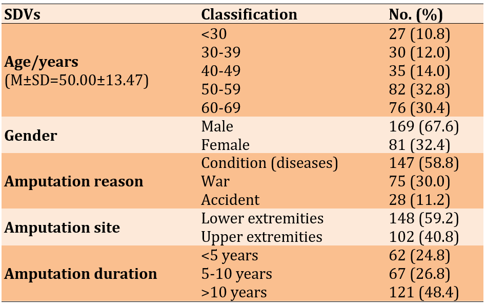 1) Amputation-related factors created for this study by researchers obtained information about the amputees related to their amputation including participants' age, gender, amputation reasons, sites, and duration.