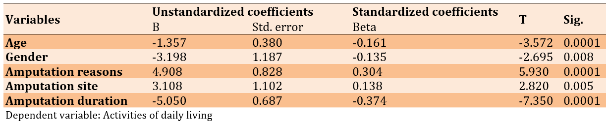 The results from a simple linear regression study showed an existing significant relationship between the reasons for amputation and activities of daily life (ADL) among amputees (β=0.304; p=0.0001). The outcome of amputation depended on the reason for it, whether it was disease, war-related injuries, or accident suggested that the reasons for amputation play a significant role in the prediction of the level of independence in performing daily tasks. The β coefficient of 0.304 showed a positive relationship between the predictor variable (amputation reasons) and the outcome variable (ADL) that was as the severity of amputation reasons goes from diseases to accidents, so the limitations in ADL increased.