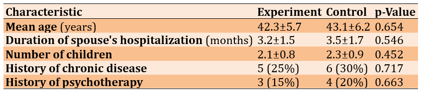 1. Mohammadi M, Rezaeisharif A, Sheykholeslami A, Ghamari Givi H. Investigating the problems of women with veteran spouses and examining the effectiveness of compassion-focused therapy on their psychological-marital problems. J Appl Psycol Res. 2024;15(2):95-112. [Persian] [