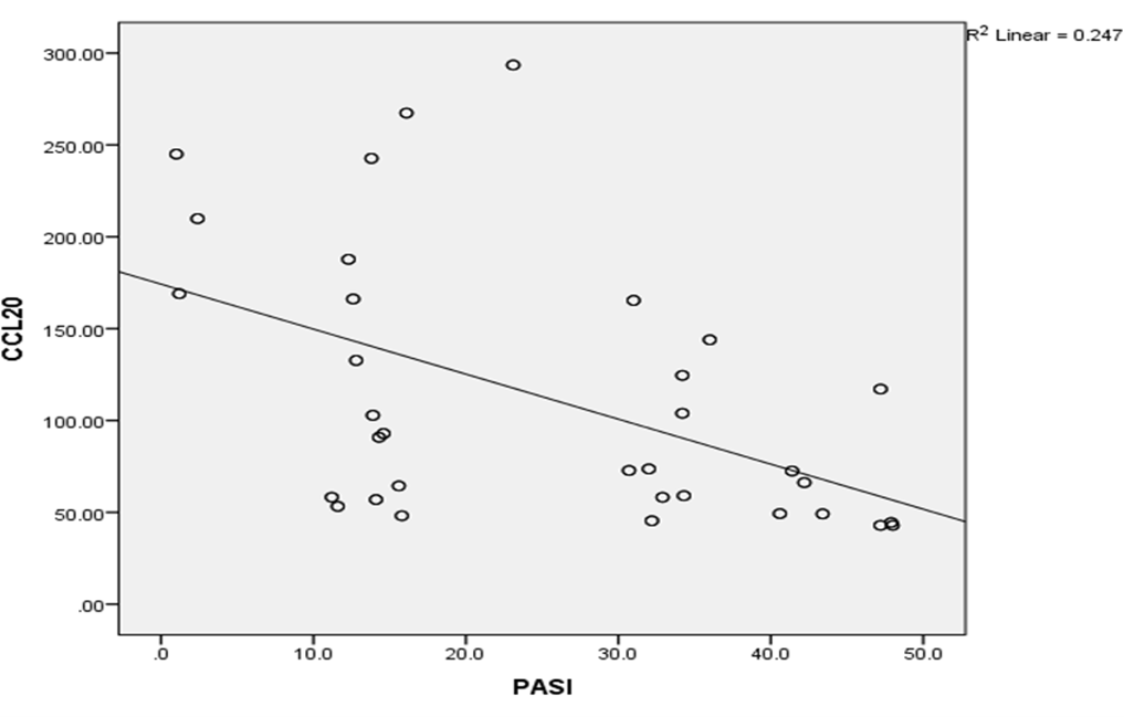 The mean serum CCL20 levels in psoriasis patients were 112.14±8.72ng/L, with values ranging from 42.89 to 293.50ng/L. The mean CCL20 levels were higher in patients with mild disease (207.96±13.88) compared to those with moderate disease (132.68±15.76) and severe disease (78.31 ± 6.48) (p-value=0.0001). The difference observed in CCL20 levels was statistically significant across the severity groups. The results showed a negative and significant correlation between PASI (the index of severity) and CCL20 levels (Figure 1).