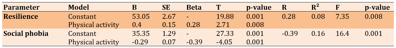 Recognizing the particular importance of these issues among veterans and individuals with disabilities [12, 13], this study aimed to predict social phobia and resilience in veteran and disabled populations based on levels of physical activity. Attention to psychological issues has consistently been a significant focus for researchers, resulting in extensive efforts to enhance psychological well-being. Physical activity accounted for approximately 16% of the variance in social phobia and 8% of the variance in resilience.