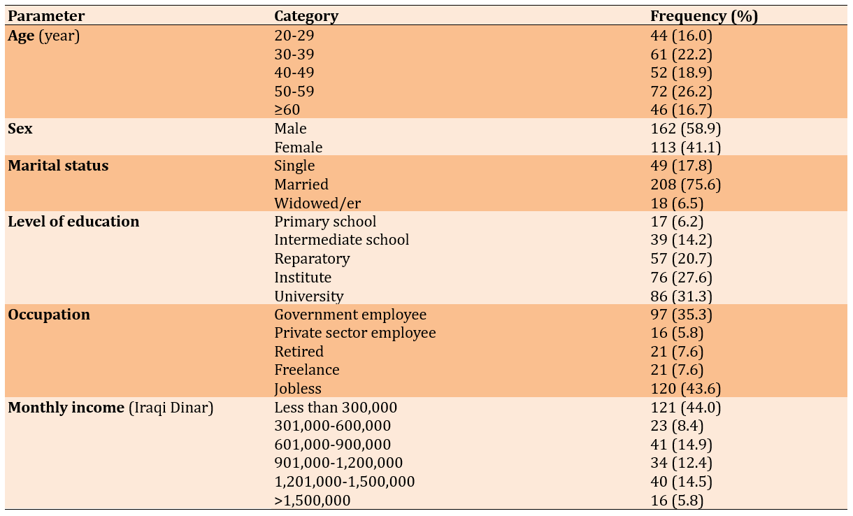 Table 1. Frequency of socio-demographic characteristics of patients with gastrointestinal cancer (n=275)