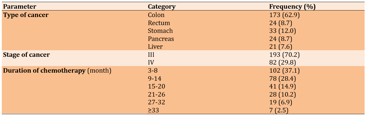 Table 2. Frequency of clinical characteristics of patients with gastrointestinal cancer (n=275)