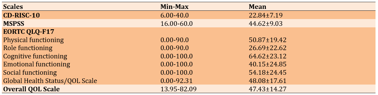 Table 3. Mean scores of resilience, quality of life, and social support in the studied patients (n=275)