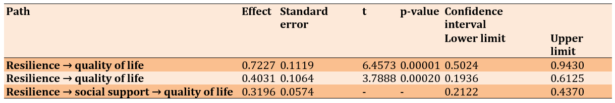 The total effect of resilience on QOL was 0.7227, indicating that increased resilience is associated with increased QOL (p<0.001), and this relationship was not random. When examining the direct effect only, it remained positive but was less strong, at 0.4031, indicating that part of the effect of resilience on QOL occurred directly without reliance on social support. The indirect effect via social support was 0.3196 and was statistically significant (Table 4).