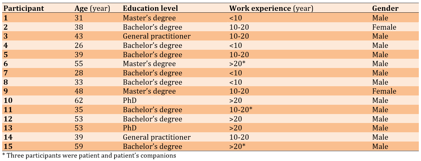 Semi-structured interviews based on an interview guide were used to collect information. From the beginning, the purpose of the study was explained to the participants, and after obtaining written consent and observing ethical considerations (such as keeping information confidential and the right of participants to withdraw from the research at any time), the interviews were conducted and recorded with the participants’ consent. Ten interviews were conducted face-to-face, and five were conducted over the phone, each lasting between 30 and 45 minutes. The interviews were conducted individually. The interviews continued until information saturation was achieved, and no new topics were raised in subsequent interviews [21].