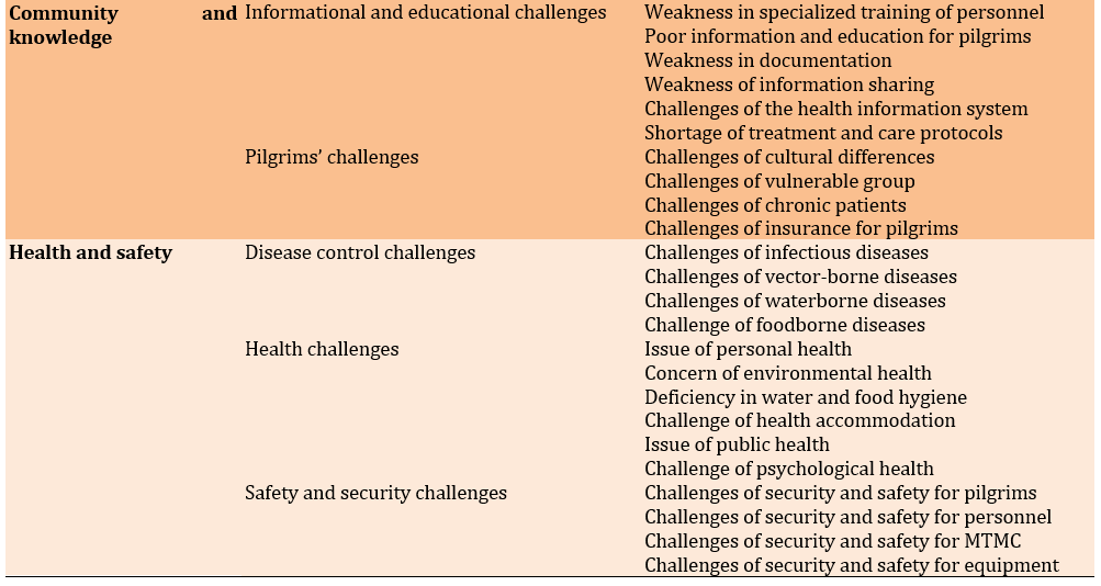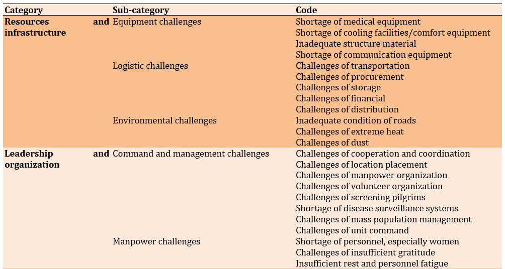 In the challenges domain, there were 4 main categories and 10 subcategories, including resources and infrastructure (equipment challenges, logistical challenges, environmental challenges), leadership and organization (command and management challenges, manpower challenges), community and knowledge (informational and educational challenges, pilgrims’ challenges), and health and safety (disease control challenges, health challenges, safety and security challenges; Table 2).