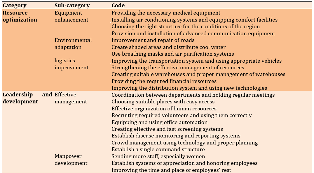 In another study, Kheradmand et al. identified nine main categories as required factors: trauma system, disease care system, health issues, education and health promotion, coordination and command of health cooperation within the health system, information management and communication, response planning, support and resource management, and safety and security [27]. These findings are consistent with our results.